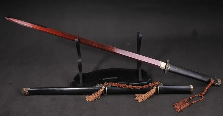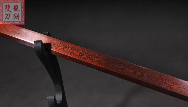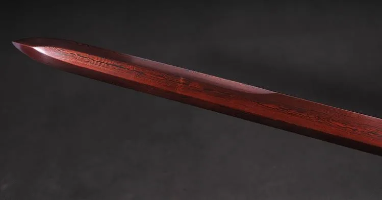 The red looking of blade is not stained but through the traditional way of making swords in long quan.